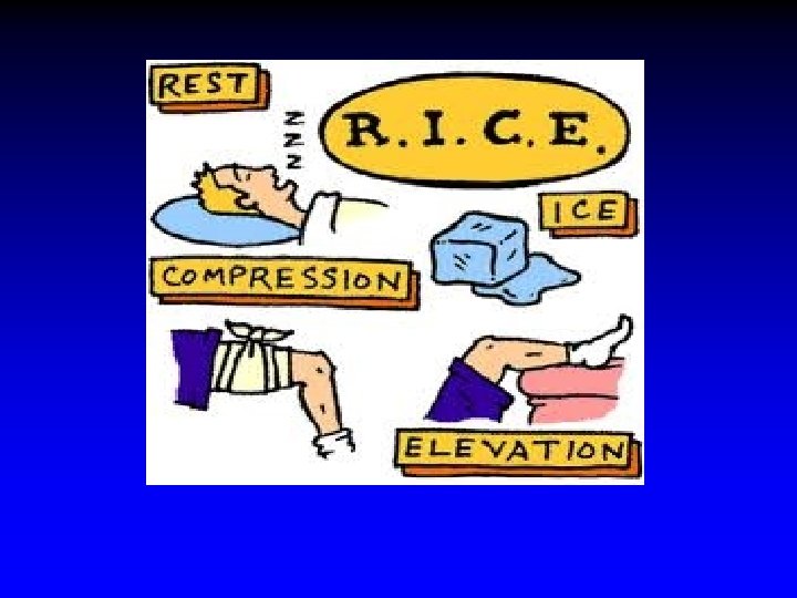 Strains&Sprains Think R. I. C. E. for the first 48 hours after the injury : R – Rest the injurest part I - Icepack or cold compress placed over the injured part immediately and continue for 20 minutes, four to eight times a day C – compression – support the injured part with an elastic compression bandage for at least 2 days E – Elevation – raise the injured part above heart level to decrease swelling