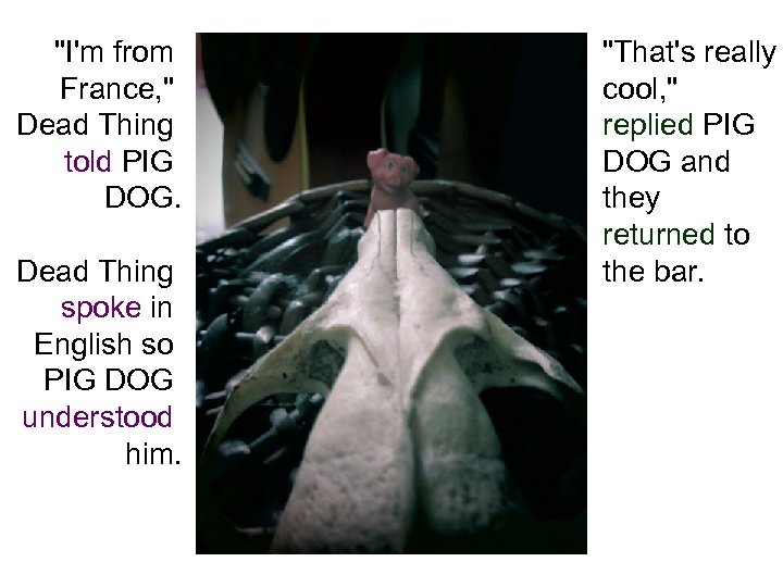 "I'm from France, " Dead Thing told PIG DOG. Dead Thing spoke in English so PIG DOG understood him. "That's really cool, " replied PIG DOG and they returned to the bar.