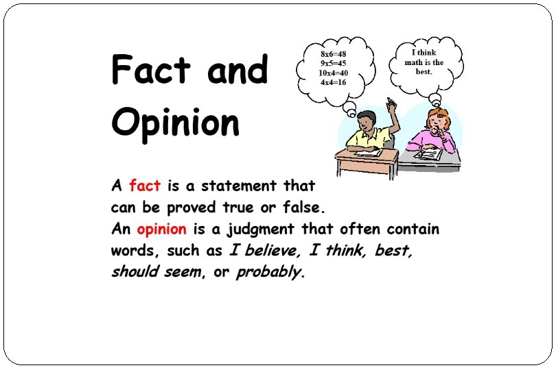 Spiral Review Fact and Opinion 519 Q A fact is a statement that can be proved true or false. Facts can usually be checked in a reference source. An opinion is a judgment cannot be proved true or false. It often contains clue words such as probably, think, believe, should, feel, and best. Tell me if these are facts or opinions: Millions of years ago, glaciers covered the land. Lightning on the prairie can be terrifying. The house was a “sorry-looking mess. ” They found half of the marriage certificate.