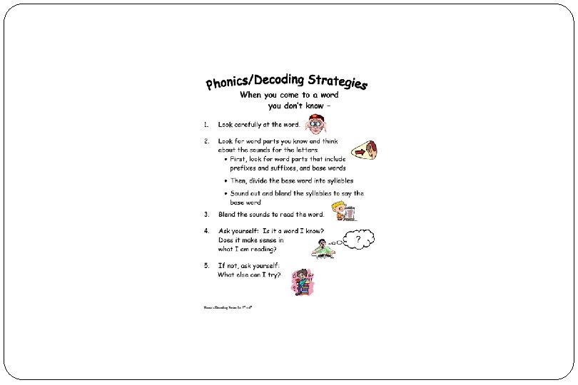 Phonics/Decoding Skills 497 A What are our Phonics/Decoding skills? They are chunking, words we know, beginning and endings, affixes, syllables, try different vowel sounds, base words or root words, blending, look carefully