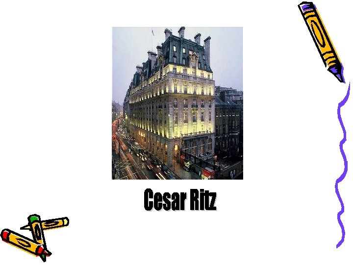 • Ritz worked as the first manager of the Savoy Hotel before he opened the Hôtel Ritz in Paris, France in 1898. • He went on to open The Ritz Hotel in London, United Kingdom and the Hotel Ritz Madrid in Madrid, Spain. Ritz enjoyed a long partnership with Escoffier, the famous French chef and father of modern French cooking. The partnership lasted until Ritz's breakdown. • Ritz was born in Niederwald, Switzerland, and died in Küsnacht, near Lucerne, Switzerland.
