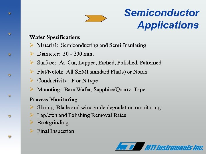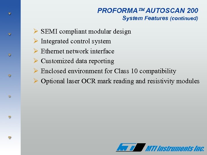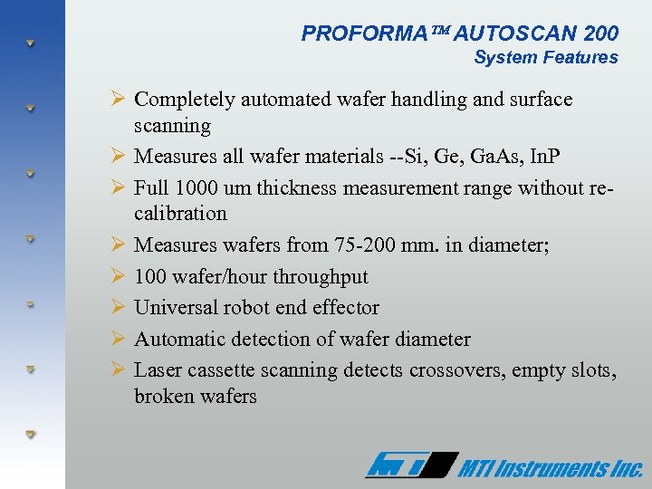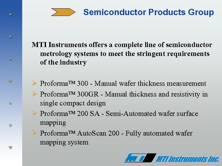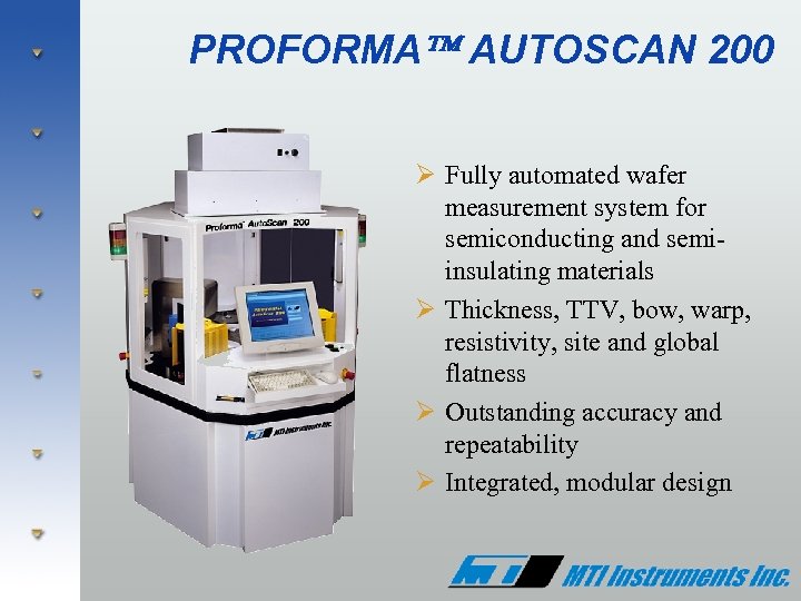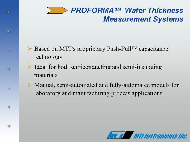 Semiconductor Products Group MTI Instruments offers a complete line of semiconductor metrology systems to meet the stringent requirements of the industry Ø Proforma™ 300 - Manual wafer thickness measurement Ø Proforma™ 300 GR - Manual thickness and resistivity in single compact design Ø Proforma™ 200 SA - Semi-Automated wafer surface mapping Ø Proforma™ Auto. Scan 200 - Fully automated wafer mapping system