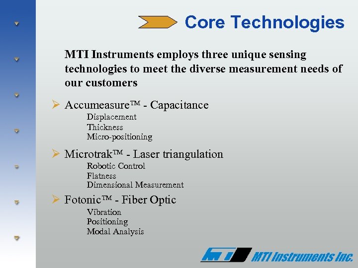 Core Technologies MTI Instruments employs three unique sensing technologies to meet the diverse measurement needs of our customers Ø Accumeasure - Capacitance Displacement Thickness Micro-positioning Ø Microtrak - Laser triangulation Robotic Control Flatness Dimensional Measurement Ø Fotonic - Fiber Optic Vibration Positioning Modal Analysis