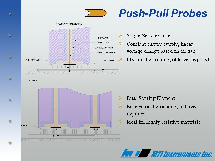 Push-Pull Probes Ø Single Sensing Face Ø Constant current supply, linear voltage change based on air gap Ø Electrical grounding of target required Ø Dual Sensing Element Ø No electrical grounding of target required Ø Ideal for highly resistive materials