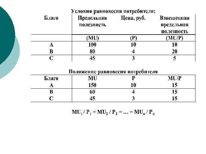 Общая и предельная полезность яблок для отдельного потребителя TU - total utility (общая полезность); MU - marginal utility (предельная возможность) Число яблок Общая полезность (сумма предельных (маржинальных) полезностей), ед. TU 1 2 3 4 5 10 Предельная (маржинальная) полезность (полезность дополнительного яблока), ед. TU 10
