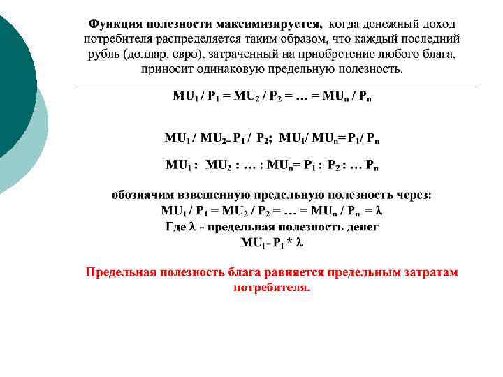 Второй закон Госсена максимум полезности от потребления заданного набора благ потребитель получит при условии равенства дополнительных ( «предельных» ) полезностей каждого из потребленных благ.