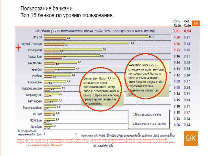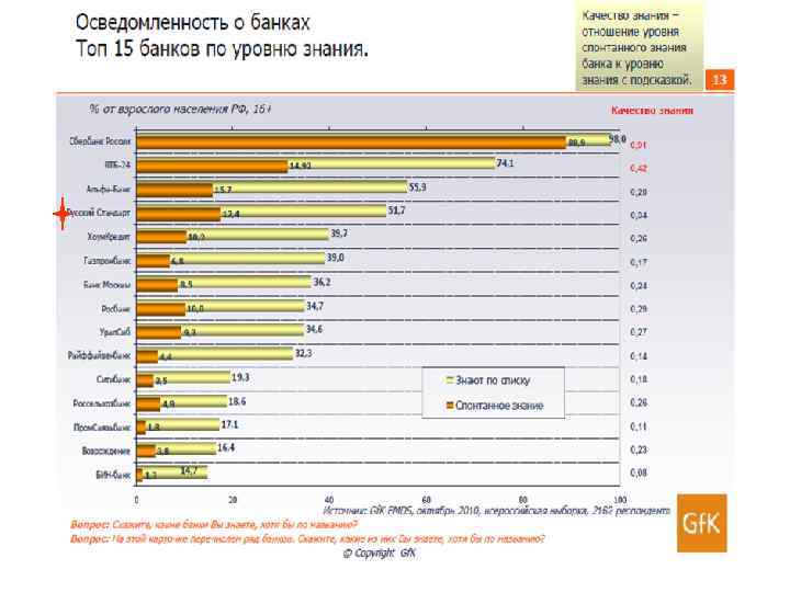 Соотношение различных столбиков – диагностика бренда Показатель уважения высокий и больше, чем знание Бренд нравится, но о нем мало знают и, соотв. возникает желание и любопытство узнать о нем побольше. У бренда – хороший потенциал развития. Показатель знания высокий и больше, чем уважение Бренд хорошо знают, но он не очень нравится. Бренд стал чем то очень привычным, знакомым, интерес к нем падает. И, соответственно, потребители ищут альтернативы. Высокие показатели знания и уважения Укоренившиеся лидеры: такие бренды добились того, что они укоренены в сердцах и умах потребителей.