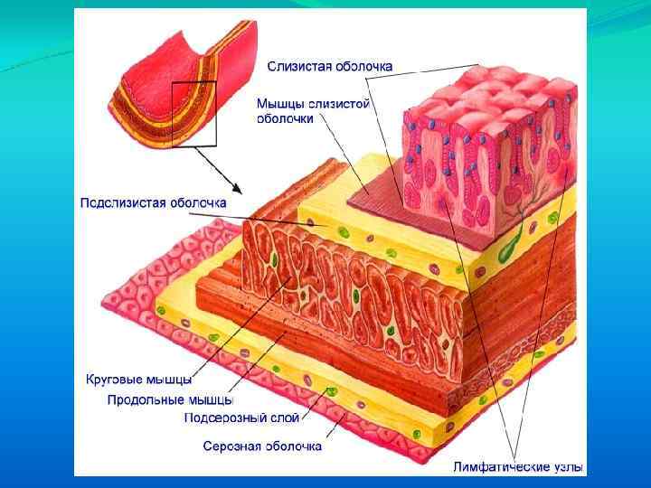 Строение стенки пищеварительного канала Длина пищеварительного тракта 8 10 м. Стенка состоит из 3 слоев: наружного соединительно-тканного — серозной оболочки, среднего мышечного (снаружи продольные, внутри кольцевые мышцы) и внутреннего подслизистого и слизистого.