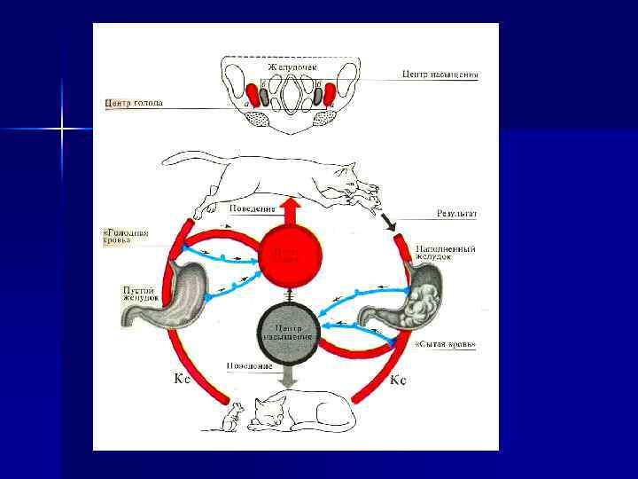 Теории голода Ø Периферические – «голодной крови» И. П. Павлова – «пустого желудка» А. Карлсона и У. Кеннона Виды насыщения: – первичное (сенсорное) – вторичное (метаболическое) Ø Центральная теория Ананда и Бробека – определяется Ø Теория функциональных систем П. К. Анохина – состоянием гипоталамических центров (концентрация питательных веществ влияет на активность центров голода и насыщения) пищевое побуждение приводит к возбуждению нервного центра и изменению поведения с вовлечением соматических и вегетативных функций (формирование пищевой мотивации)
