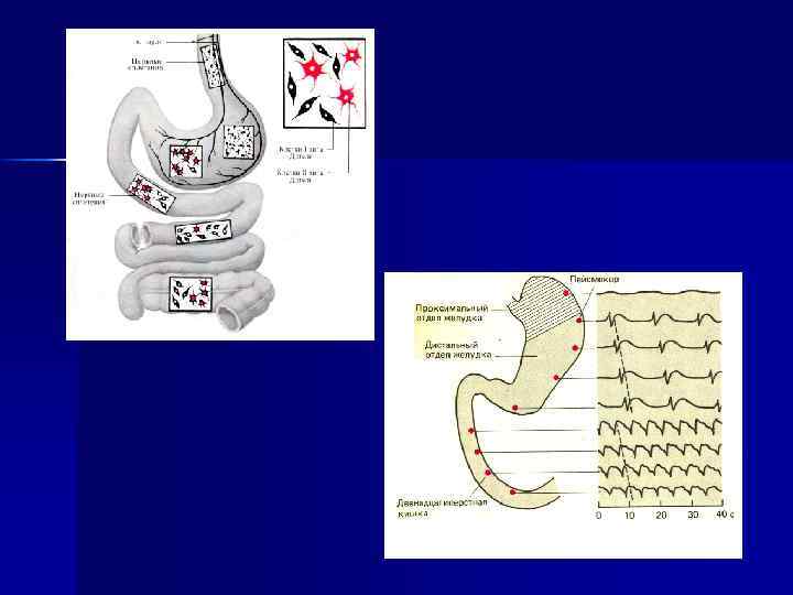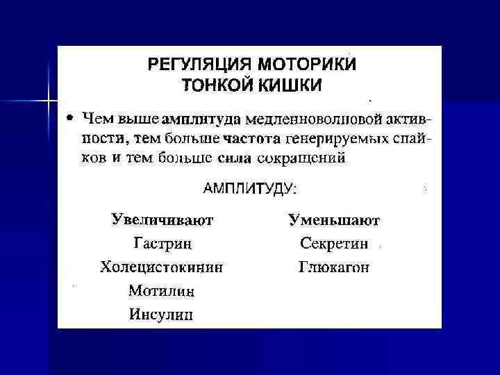 Регуляция моторики Стимулируют Ø Ацетилхолин в малых дозах (в больших – тормозит) Ø Ядра передних и средних отделов гипоталамуса Ø Лимбическая система Тормозят Ø Катехоламины Ø Ядра заднего отдела гипоталамуса Ø Страх, испуг, опасность, беспокойство, боль