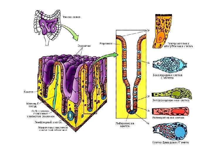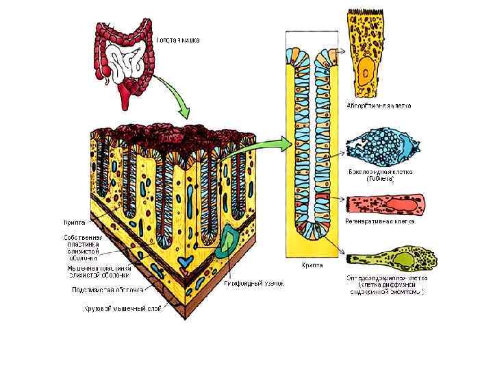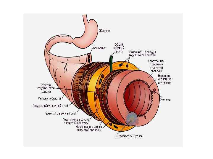12. Червеобразный отросток Окраска: гематоксилин-эозин 1 - слизистая оболочка: 1. 1 - однослойный столбчатый эпителий, 1. 2 - собственная пластинка, инфильтрированная лимфоцитами, 1. 2. 1 - крипта; 2 - подслизистая основа, 2. 1 - лимфоидные узелки, 2. 2 - диффузные скопления лимфоцитов, 2. 3 - кровеносные сосуды; 3 - мышечная оболочка; 4 - серозная оболочка: 4. 1 - рыхлая волокнистая соединительная ткань, 4. 2 - мезотелий
