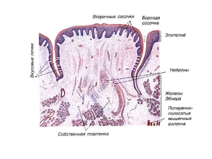 Сосочки языка Нитевидные и грибовидные Листовидные Желобоватые 1 нитевидный сосочек, 2 грибовидный сосочек, 3 листовидный сосочек, 4 вкусовые почки, 5 слюнные серозные железы языка, 6 желобоватый сосочек