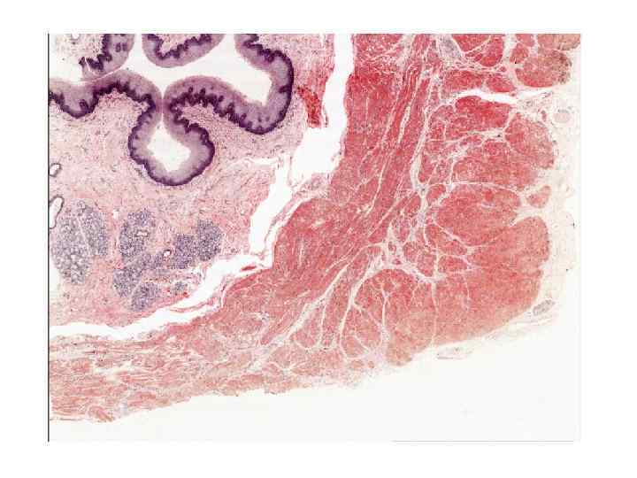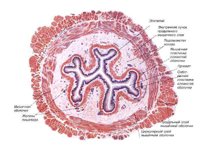 Переход пищевода в желудок. I. СЛИЗИСТАЯ ОБОЛОЧКА: 2 А многослойный плоский неороговевающий эпителий пищевода, 1 Б ямки желудка, 2 Б однослойный цилиндрический эпителий, 3 собственная пластинка слизистой оболочки: 3 Б кардиальные железы желудка, 3 В лимфатический фолликул, 4 мышечная пластинка слизистой оболочки II. ПОДСЛИЗИСТАЯ ОСНОВА: IIА собственные железы пищевода; III. МЫШЕЧНАЯ ОБОЛОЧКА