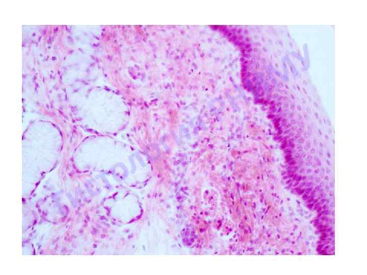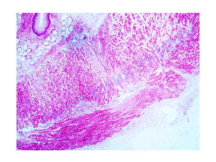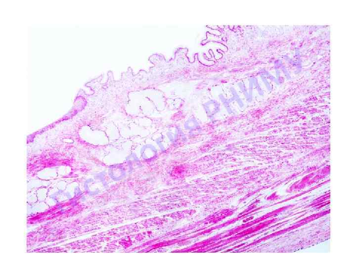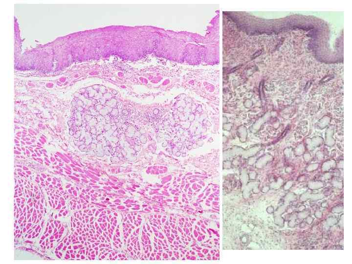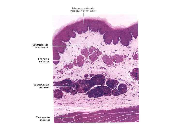 Переход пищевода в желудок 1 многослойный плоский неороговевающий эпителий пищевода, 2 однослойный железистый эпителий желудка, 3 собственные железы пищевода.