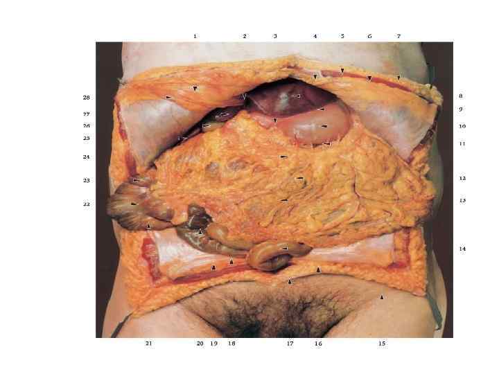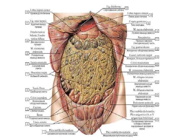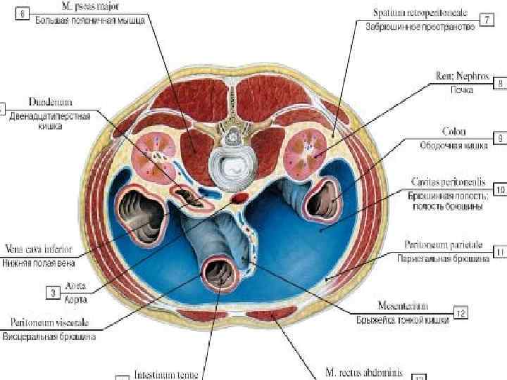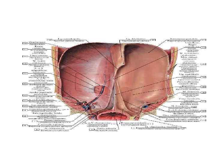 Брюшная полость, cavitas abdominis - пространство, ограниченное мышцами и выстланное внутрибрюшной фасцией. Стенки: • диафрагма — сверху; • передне-латеральная группа мышц живота — спереди и с боков; • поясничный отдел позвоночного столба с большой поясничной мышцей и квадратной мышцей поясницы — сзади; • внутренние стенки большого и малого таза, мышцы промежности — снизу.