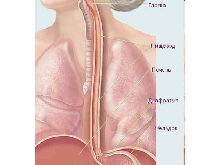 Пищевод - это длинная трубка, соединяющая глотку с желудком, лежит сзади трахеи. Длина его у взрослого человека 23 - 25 см. Он начинается на уровне VI - VII шейного позвонка и заканчивается на уровне XI грудного позвонка. В стенке пищевода хорошо развит мышечный слой, состоящий из продольных и кольцевых волокон. Верхняя часть пищевода образована поперечно-полосатой мышечной тканью, а остальная часть - гладкой. Мышцы пищевода, сокращаясь, продвигают пищевой комок. Слизистая пищевода складчатая, образована многослойным эпителием, может сильно растягиваться, выделяет слизь, способствующую продвижению пищи, но не вырабатывает ферментов. Ферментативная обработка пищи при движении по пищеводу происходит под действием ферментов слюны.