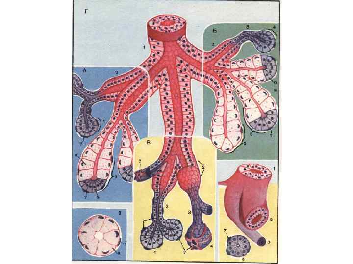 Подчелюстная железа 1. Смешанный концевой отдел А) слизистые клетки Б) серозные клетки 2. Серозный концевой отдел. 3. Миоэпителио цит. 4. Исчерченный проток. 5. Вставочный проток.