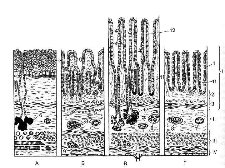 Небная миндалина 1. Крипта миндалины 2. Эпителий инфильтриро ванный лимфоцитами. 3. Неинфильтри рованный эпителий. 4. Лимфатический фолликул. 5. Слущенные клетки и лимфоциты