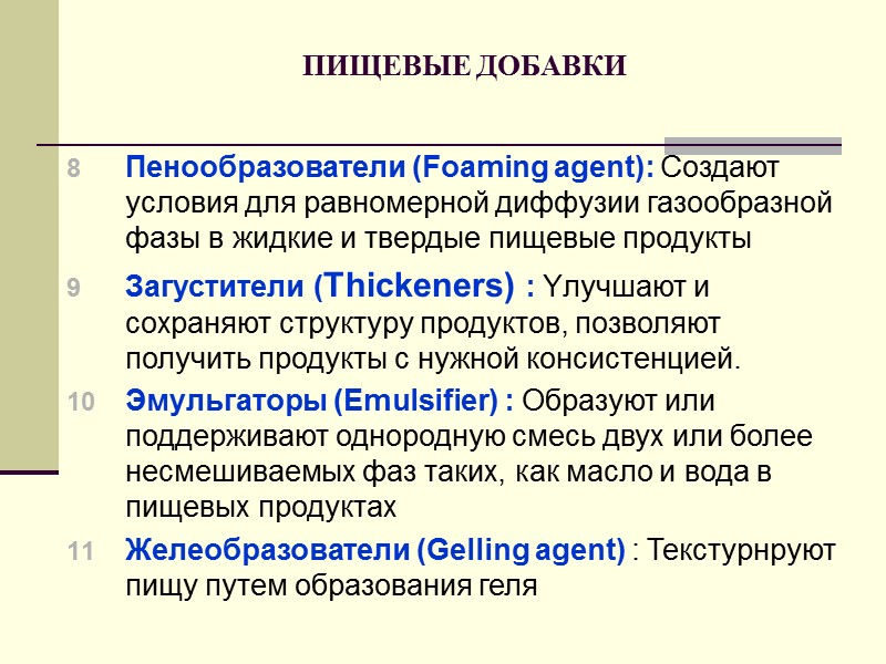 ПИЩЕВЫЕ ДОБАВКИ Пенообразователи (Foaming agent): Создают условия для равномерной диффузии газообразной фазы в жидкие и твердые пищевые продукты Загустители (Thickeners) : Yлучшают и сохраняют структуру продуктов, позволяют получить продукты с нужной консистенцией. Эмульгаторы (Emulsifier) : Образуют или поддерживают однородную смесь двух или более несмешиваемых фаз таких, как масло и вода в пищевых продуктах Желеобразователи (Gelling agent) : Текстурнруют пищу путем образования геля