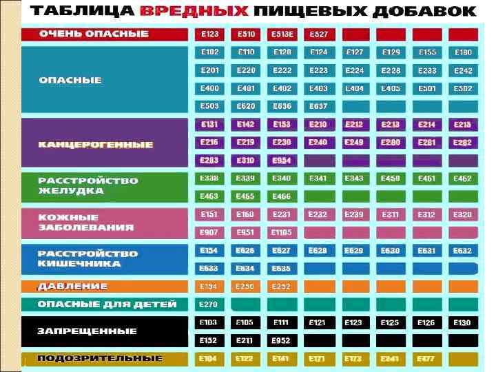 Е-129 – канцероген; Е-110, 132, 322 – вызывают аллергические реакции; Е-171 – вызывает заболевания печени; Е-124 – провоцирует приступы астмы