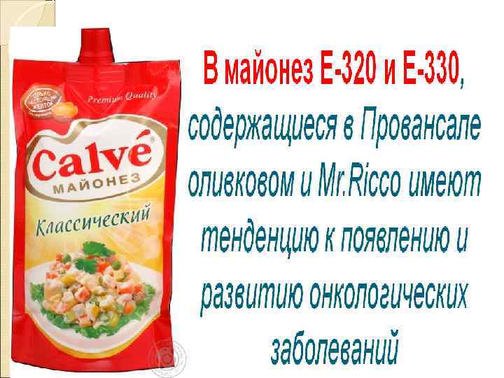 ПОЛЕЗНЫЕ И НЕЙТРАЛЬНЫЕ ДОБАВКИ Е 101 — рибофлавин. Это не что иное, как витамин В 2. E 140 — хлорофилл. Безобидное вещество, которое придает растениям зеленый цвет. Е 152 — уголь. Всем известное полезное ископаемое, абсолютно безвредное. Е 160 a — каротины. Вещества, близкие по свойствам к витамину А. Е 161 b — лютеин. Витаминоподобное вещество, способствующее улучшению зрения, используется в лекарствах. E 163 — антоцианы. Растительные пигменты, придающие окраску листьям и лепесткам цветов. E 181 — танины. Группа веществ, аналогичных компоненту чая, придающих ему терпкий вкус. E 202 — сорбат калия. Один из наиболее популярных консервантов, абсолютно безвреден. Е 260 — уксусная кислота. Безвредный компонент натурального происхождения. E 296 — яблочная кислота. “Кислинка” яблочного происхождения. Е 270 — молочная кислота. Естественное вещество, образующееся при молочнокислом брожении (скисание молока, квашение капусты и др. ).
