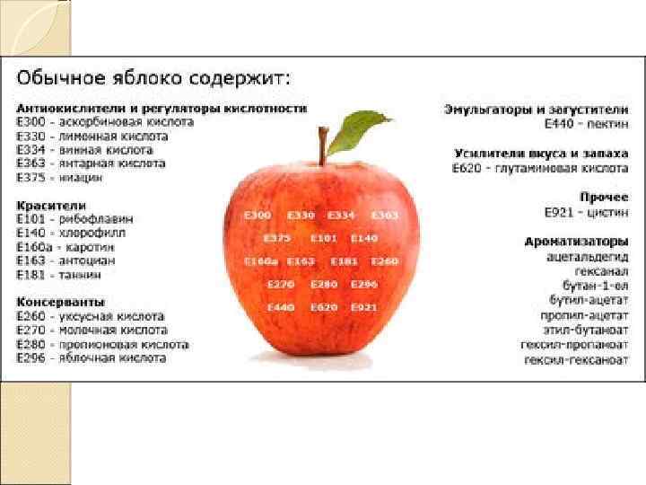 ПОЛЕЗНЫЕ И НЕЙТРАЛЬНЫЕ ДОБАВКИ E 290 — углерода диоксид. Не что иное, как углекислый газ, превращающий напиток в газировку. Е 300 — аскорбиновая кислота. Всеми любимый витамин С, друг иммунитета. E 306—Е 309 — токоферолы. Другими словами, это витамины Е различных форм. Е 406 — агар-агар. Несмотря на подозрительно частое использование в кондитерской промышленности, натурален и безвреден. Е 440 — пектины. Они присутствуют во всех наземных растениях (особенно много в яблоках). Способствуют очистке кишечника, выводят шлаки. Е 500 — гидрокарбонат натрия. Не что иное, как пищевая сода. Е 507 — соляная кислота. Аналогичное вещество вырабатывается у нас в желудке. Е 641 — L-лейцин. Одна из полезных аминокислот. Е 642 — лизин. Еще одна полезная аминокислота. Е-916, Е 917 — кальция йодат. Используется для обогащения продуктов питания полезным для здоровья йодом.