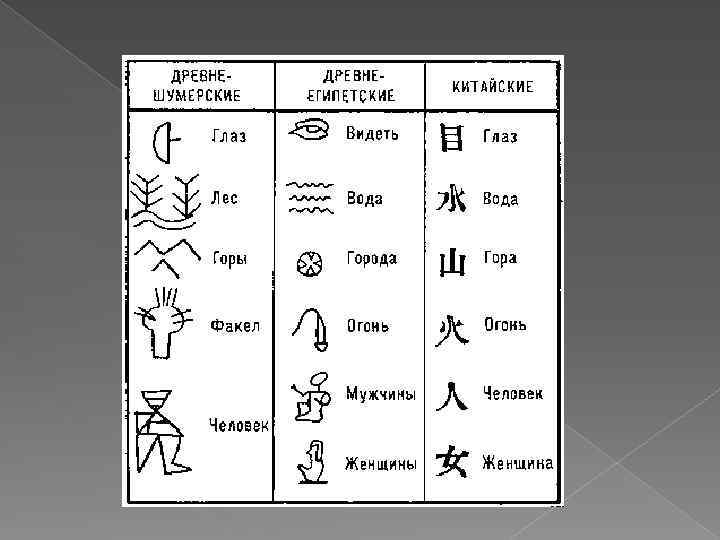 Идеографическое письмо В идеографическом письме каждый знак (изобразительный элемент) может обозначать любое слово в любой грамматической форме в пределе круга понятийных ассоциаций, либо прямо вызываемых изображением, составляющим данный знак, либо условных. Круг возможных значений изобразительного элемента ограничен соседним кругом значений, например знак, изображающий «ногу» , может означать ‘ходить’, ‘стоять’, ‘приносить’ и т. п. в любой грамматической форме, но не может означать ‘ступня’, ‘подошва’, потому что для этого существует другой изобразительный элемент. Вместо изображения возможно употребление и произвольного графического символа. Возможность передачи информации с помощью чистой идеографии очень ограничена; этот тип письма существовал лишь как переходный от пиктографии к словесно слоговому письму, применяясь либо в хозяйственных записях, где число понятий, о которых может идти речь, ограничено самим содержанием текста (ранний Шумер, начало 3‑го тыс. до н. э. ), либо в ритуальных записях как мнемоническое вспомогательное средство. Неясно, была ли идеографическим или словесно слоговым письмом письменность острова Пасхи и чукотское письмо, изобретённое в 20 в. Теневилем.