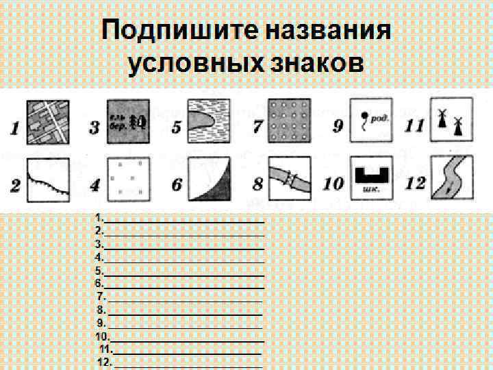 Домашнее задание: 12 параграф пересказывать, условные знаки учить, повторить МАСШТАБ подготовиться к топографическому диктанту 1. 2. 3. 4. 5. 6. ТВОРЧЕСКОЕ: Придумай свои условные топографические знаки Внимательно осмотри свой двор. Как много в нем различных предметов — это деревья, кустарники, детская песочница, сушилка для белья и многое другое. Посмотри, какие предметы двора можно изобразить знакомыми тебе условными топографическими знаками. Подсказкой для тебя будут приведенные в географическом атласе 6 -го класса условные знаки. Посмотри, для каких предметов двора условных топографических знаков не существует. Придумай их сам. Нарисуй в тетради и подпиши условные знаки предметов твоего двора. Привлеки к этой работе друзей и родителей, так будет интереснее и веселее. Придумай игры с условными географическими знаками. Например, опиши маршрут твоего движения по двору, используя топографические знаки.