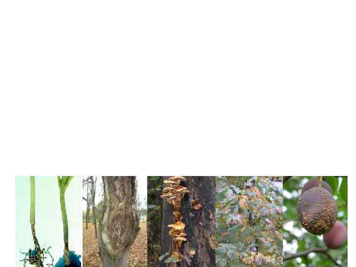 Taphrina deformans на листьях персика Pholiota adiposa: плодовые тела на живом вязе, будут еще долго появляться на мертвой древесине после гибели дерева Cytospora chrysosperma: Bisporella citrina на гниющих древесных остатках на отмирающей вследствие обморожения ветви живого тополя