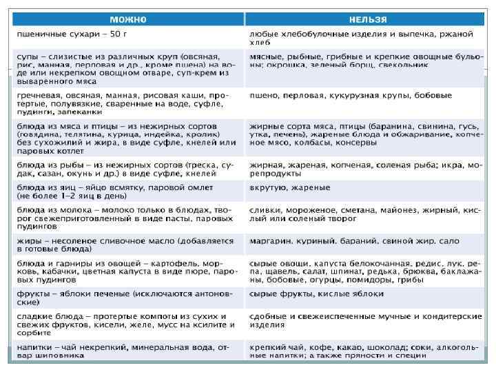Ограничиваются: рыба, сыр, колбаса, копчености; овощи, рассолы. Исключаются: минеральные воды, хлебный квас, пиво, вино, водка; жареные блюда. Разрешаются: пища тушеная, отварная, печеная; сливочное и растительное масло.