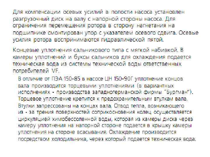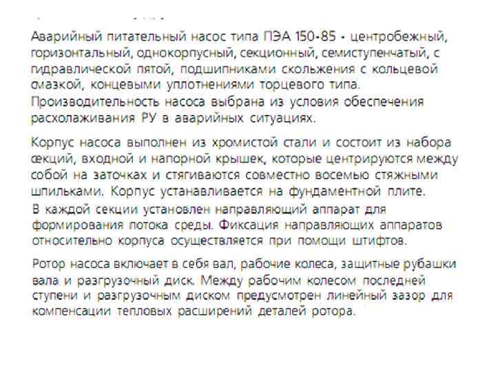 Питательный насос ПЭ 150 – 85 У 4 Агрегат электронасосный питательный ПЭ 150 – 85 У 4, предназначен для подачи питательной воды в парогенераторы ПГВ – 1000 в режимах расхолаживания энергоблока, а также для пусковой деаэрации питательной воды, заполнения парогенераторов перед пуском блока, питания ПГ при пусках и работе при малых нагрузках (до ~ 7% номинальной). Насос питательный ПЭ 150 – 85 У 4, центробежный, горизонтальный, секционный, однокорпусной, семиступенчатый, с гидравлической пятой, подшипниками скольжения с кольцевой смазкой и сальниковыми концевыми уплотнениями.