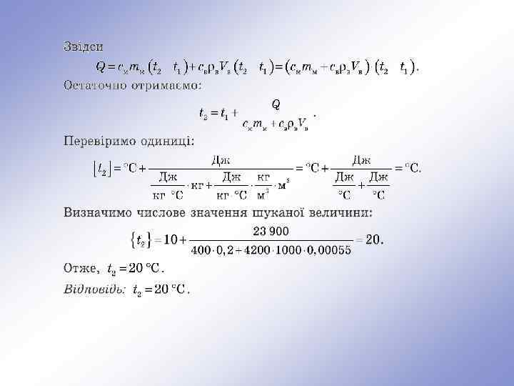 Розв’язок Відповідно до визначення, Звідси знаходимо кінцеву температуру печі: Перевіряємо одиниці величин: З таблиці знаходимо, що питома теплоємність цегли дорівнює Обчислюємо температуру печі: