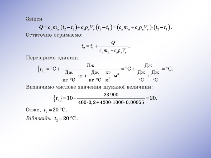 Задача 1 Для нагрівання цегельної печі масою 1,5 т витрачено 26,4 МДж теплоти. До якої температури нагріли піч, якщо початкова температура була 10 °C? ПРИКЛАДИ РОЗВЯЗУВАННЯ ЗАДАЧ