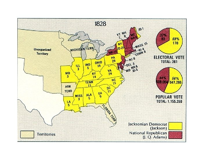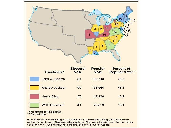 The Election of 1824: The “Corrupt Bargain” (no candidate has the majority of electoral votes) What is that number? Popular Vote Electoral Vote Andrew Jackson 43% 99 J. Q. Adams 31% 84 William Crawford 13% 41 Henry Clay 13% 37 Candidate