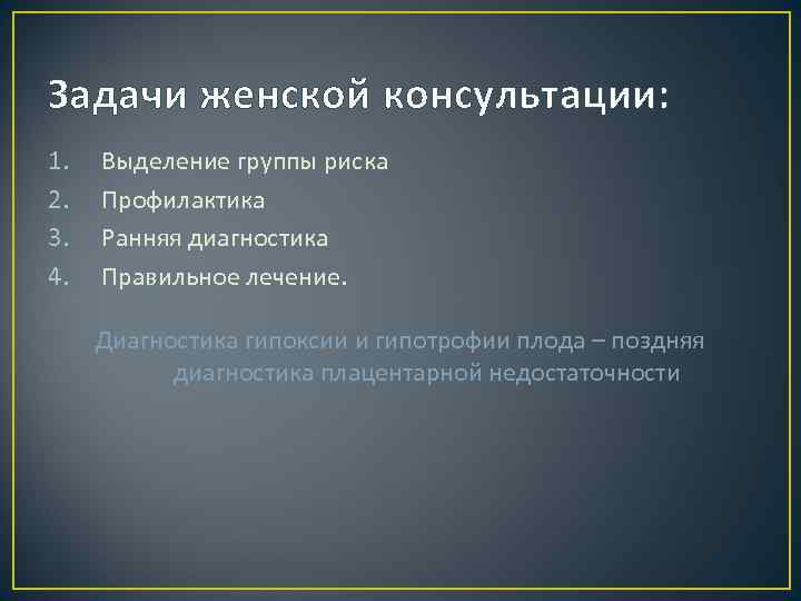 Задачи женской консультации: 1. 2. 3. 4. Выделение группы риска Профилактика Ранняя диагностика Правильное лечение. Диагностика гипоксии и гипотрофии плода – поздняя диагностика плацентарной недостаточности