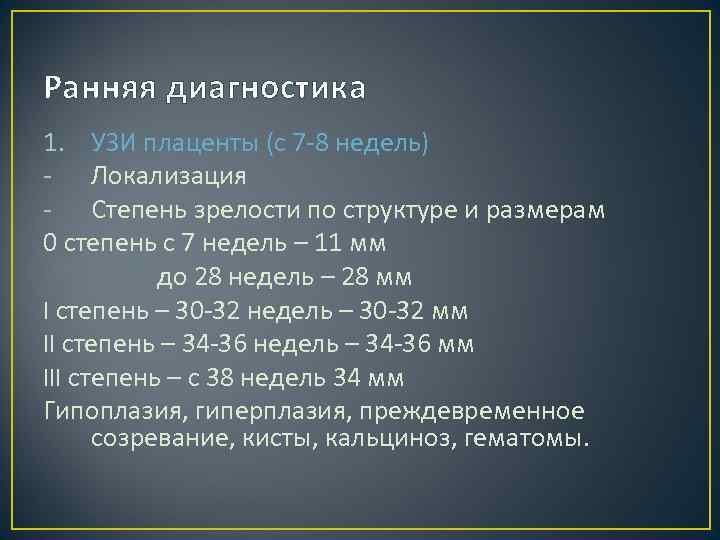 Ранняя диагностика 1. УЗИ плаценты (с 7 -8 недель) - Локализация - Степень зрелости по структуре и размерам 0 степень с 7 недель – 11 мм до 28 недель – 28 мм I степень – 30 -32 недель – 30 -32 мм II степень – 34 -36 недель – 34 -36 мм III степень – с 38 недель 34 мм Гипоплазия, гиперплазия, преждевременное созревание, кисты, кальциноз, гематомы.