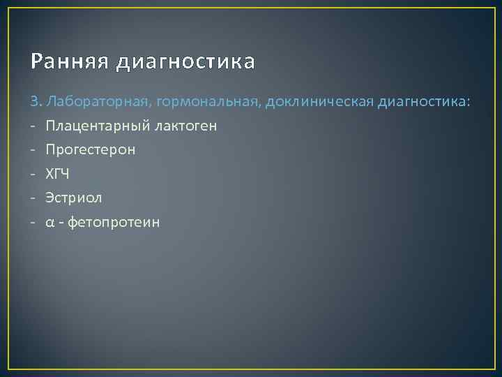 Ранняя диагностика 3. Лабораторная, гормональная, доклиническая диагностика: - Плацентарный лактоген - Прогестерон - ХГЧ - Эстриол - α - фетопротеин