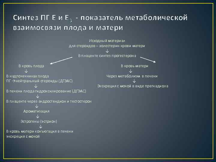 Синтез ПГ Е и Е 3 - показатель метаболической взаимосвязи плода и матери Исходный материал для стероидов – холестерин крови матери ↓ В плаценте синтез прогестерона В кровь плода ↓ В надпочечниках плода ПГ →нейтральный стероиды (ДГЭАС) ↓ В печени плода гидроксилирование (ДГЭАС) ↓ В плаценте через андростендион и тестостерон ↓ Ароматизация ↓ Эстрогены (эстрион) ↓ В кровь матери конъюгация в печени экскреция с мочой В кровь матери ↓ Через метаболизм в печени ↓ Экскреция с мочой в виде прегнадиола