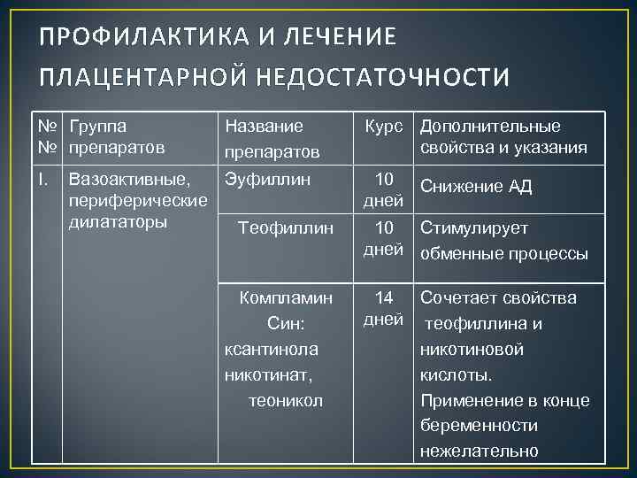 ПРОФИЛАКТИКА И ЛЕЧЕНИЕ ПЛАЦЕНТАРНОЙ НЕДОСТАТОЧНОСТИ № Группа № препаратов I. Название препаратов Вазоактивные, Эуфиллин периферические дилататоры Теофиллин Компламин Син: ксантинола никотинат, теоникол Курс Дополнительные свойства и указания 10 Снижение АД дней 10 Стимулирует дней обменные процессы 14 Сочетает свойства дней теофиллина и никотиновой кислоты. Применение в конце беременности нежелательно