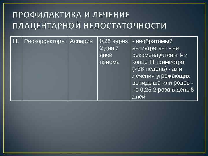 ПРОФИЛАКТИКА И ЛЕЧЕНИЕ ПЛАЦЕНТАРНОЙ НЕДОСТАТОЧНОСТИ III. Реокорректоры Аспирин 0, 25 через 2 дня 7 дней приема - необратимый антиагрегант - не рекомендуется в I- и конце III триместра (>38 недель) - для лечения угрожающих выкидыша или родов по 0, 25 2 раза в день 5 дней