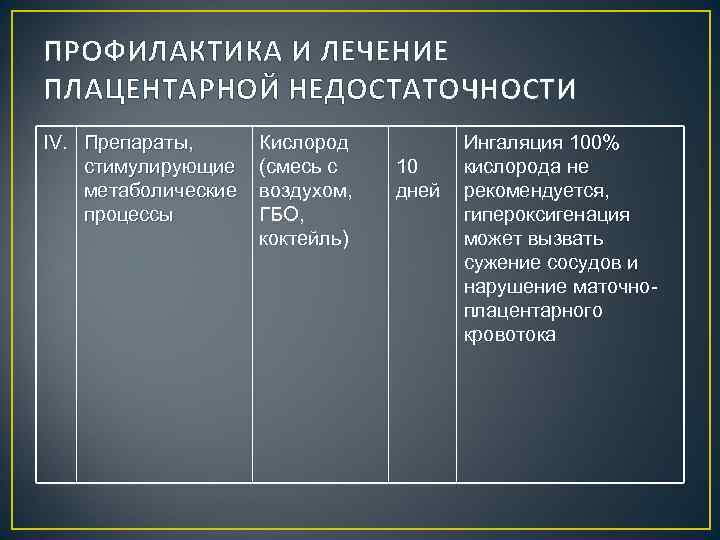 ПРОФИЛАКТИКА И ЛЕЧЕНИЕ ПЛАЦЕНТАРНОЙ НЕДОСТАТОЧНОСТИ IV. Препараты, стимулирующие метаболические процессы Кислород (смесь с воздухом, ГБО, коктейль) 10 дней Ингаляция 100% кислорода не рекомендуется, гипероксигенация может вызвать сужение сосудов и нарушение маточноплацентарного кровотока