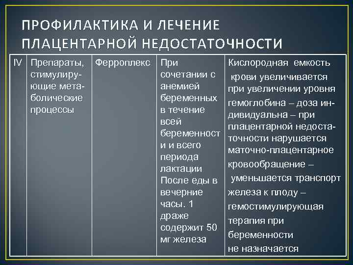 ПРОФИЛАКТИКА И ЛЕЧЕНИЕ ПЛАЦЕНТАРНОЙ НЕДОСТАТОЧНОСТИ IV Препараты, стимулирующие метаболические процессы Ферроплекс При сочетании с анемией беременных в течение всей беременност и и всего периода лактации После еды в вечерние часы. 1 драже содержит 50 мг железа Кислородная емкость крови увеличивается при увеличении уровня гемоглобина – доза индивидуальна – при плацентарной недостаточности нарушается маточно-плацентарное кровообращение – уменьшается транспорт железа к плоду – гемостимулирующая терапия при беременности не назначается
