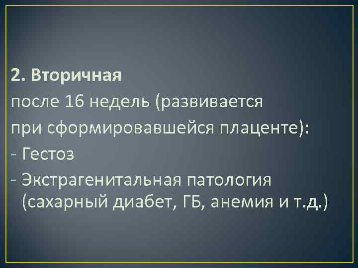 2. Вторичная после 16 недель (развивается при сформировавшейся плаценте): - Гестоз - Экстрагенитальная патология (сахарный диабет, ГБ, анемия и т. д. )