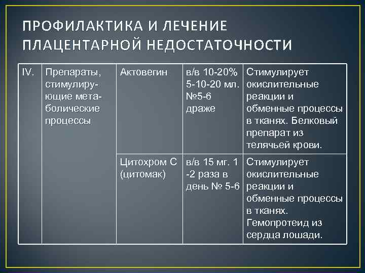 ПРОФИЛАКТИКА И ЛЕЧЕНИЕ ПЛАЦЕНТАРНОЙ НЕДОСТАТОЧНОСТИ IV. Препараты, стимулирующие метаболические процессы Актовегин в/в 10 -20% 5 -10 -20 мл. № 5 -6 драже Стимулирует окислительные реакции и обменные процессы в тканях. Белковый препарат из телячьей крови. Цитохром С (цитомак) в/в 15 мг. 1 -2 раза в день № 5 -6 Стимулирует окислительные реакции и обменные процессы в тканях. Гемопротеид из сердца лошади.