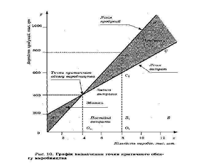 В графічному вигляді зображені лінійні функції динаміки витрат і виручки від продажу турів. У зв'язку з наявністю постійних витрат виробництво турпослуг до певного критичного обсягу (Nкр ) є збитковим — площа 1. Критичний обсяг виробництва турпослуг називається точкою беззбитковості. При зростанні обсягу виробництва частка по стійних витрат в їхній загальній (сукупній) величині знижуєть ся, зменшуються збитки, і після досягнення критичного обсягу Nкр виробництво турпродукту стає рентабельним — площа 2.
