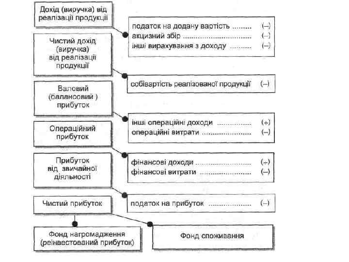 ЗВІТ ПРО ФІНАНСОВІ РЕЗУЛЬТАТИ ПІДПРИЄМСТВА (форма 2) Обчисл = Дохід (виторг) від реалізації продукції (товарів, робіт, послуг) Податок на додану вартість Акцизний збір Інші відрахування з доходу = Чистий дохід (виторг) від реалізації продукції (товарів, робіт, послуг) Собівартість реалізованої продукції (товарів, робіт, послуг) = Валовий: (прибуток, збиток) Інші операційні доходи Адміністративні витрати Витрати на збут Інші операційні витрати = Фінансові результати від операційної діяльності: (прибуток, збиток) + Дохід від участі в капіталі + Інші фінансові доходи + Інші доходи Фінансові витрати Утрати від участі в капіталі Інші витрати = Фінансові результати від звичайної діяльності до оподаткування: (прибуток, збиток) Податок на прибуток від звичайної діяльності = Фінансові результати від звичайної діяльності: (прибуток, збиток) + Надзвичайні: (доходи, витрати) Податки з надзвичайного прибутку = Чистий: прибуток збиток