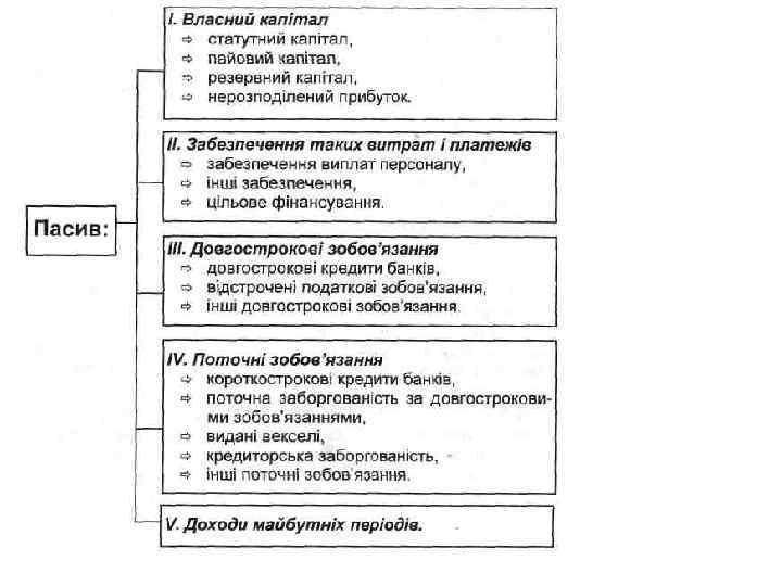 Пасиви — це сума зобов'язань фірми перед кредиторами, інши ми фірмами, організаціями, банками. Пасиви поділяють на поточні та довгострокові. Поточні пасиви — це зобов'язання фірми, які мають бути спла чені протягом одного фінансового року. До поточних пасивів, зок рема, належать : • кредиторська заборгованість фірми — кошти, які фірма заборгувала своїм постачальникам, придбавши їх товари (послуги) в кредит; • заборгованість податковим органам. Фірма регулярно отримує прибуток від реалізації своєї продукції (послуг). Але податки фірма сплачує в певні заздалегідь визначені строки. Через це фірма прак тично завжди виступає як боржник податкових органів; • видатки, що нараховані до виплати — це різноманітні вже на раховані, але ще не сплачені виплати (нарахована, але невиплачена заробітна плата персоналу фірми, проценти по кредитах, страхові, пенсійні нарахування тощо).