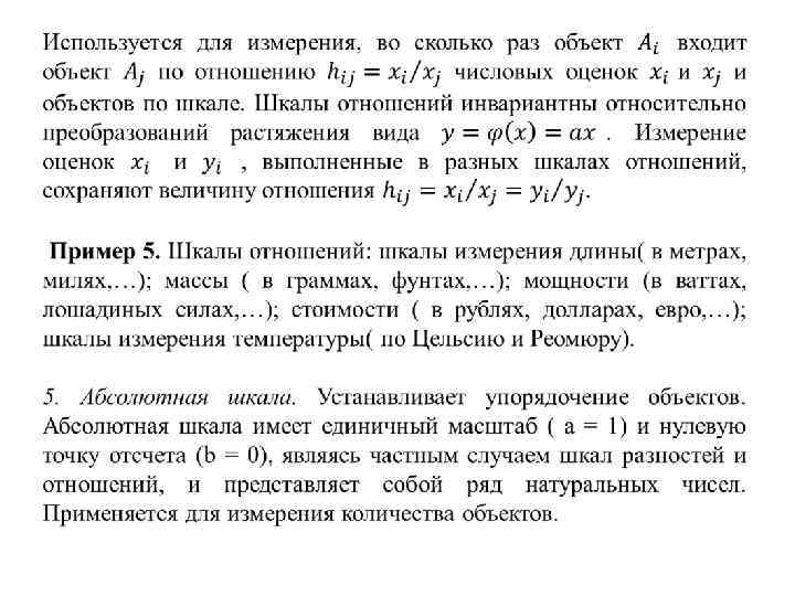 Пример 3. Шкала интервалов: шкала измерения времени с масштабами секунда, минута, час, сутки, месяц, год, век, и соответствующими разными начальными точками отсчета; шкалы измерения температуры по Реомюру, Фаренгейту, Цельсию и Кельвину. Частным случаем шкалы интервалов является шкала разностей, имеющая единичный масштаб (а =1) и некоторую произвольную начальную точку отсчета ( b - любое число ). Пример 4. Шкалы разностей: системы летоисчисления( по Старому и Новому стилю, от Сотворения Мира, от Рождества Христова и т. П. ); часовые пояса измерение времени; шкала измерения температуры по Цельсию и Кельвину. 4. Шкала отношений. Устанавливает упорядочение объектов в зависимости от величины различия какого-либо свойства. Шкала отношений имеет определенный масштаб (a > 0) и нулевую точку отсчета (b = 0), представляет собой частный случай шкалы интервалов.