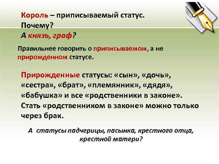 Король – приписываемый статус. Почему? А князь, граф? Правильнее говорить о приписываемом, а не прирожденном статусе. Прирожденные статусы: «сын» , «дочь» , «сестра» , «брат» , «племянник» , «дядя» , «бабушка» и все «родственники в законе» . Стать «родственником в законе» можно только через брак. А статусы падчерицы, пасынка, крестного отца, крестной матери?