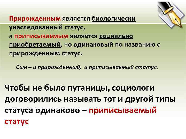 Прирожденным является биологически унаследованный статус, а приписываемым является социально приобретаемый, но одинаковый по названию с прирожденным статус. Сын – и прирожденный, и приписываемый статус. Чтобы не было путаницы, социологи договорились называть тот и другой типы статуса одинаково – приписываемый статус